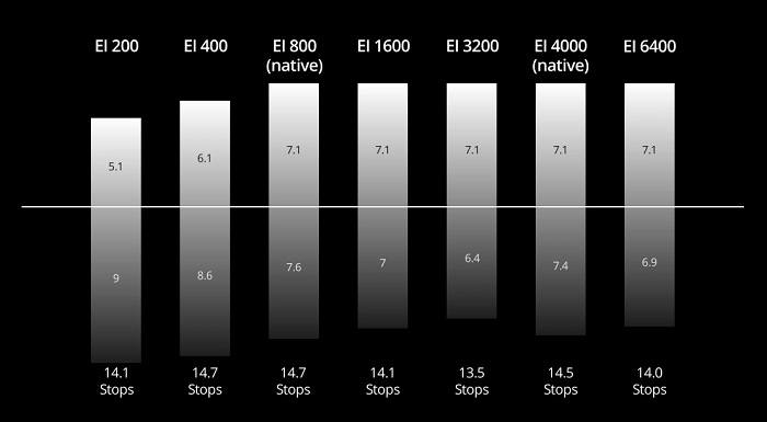 Visto il carattere squisitamente "pro" di questa macchina da presa, grande attenzione è stata al sensibilità alla luce, con ben 14 stop complessivi di regolazione della scala dei grigi che permette quindi di catturare ricchi dettagli di luci e ombre anche in scenari di illuminazione complessi come possono essere albe e tramonti.